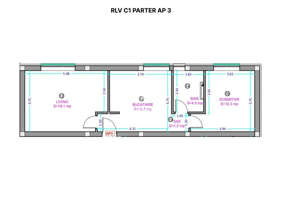 Apartament disponibil la parter cu predare la alb - suprafata utila - 51.2 mp utili.