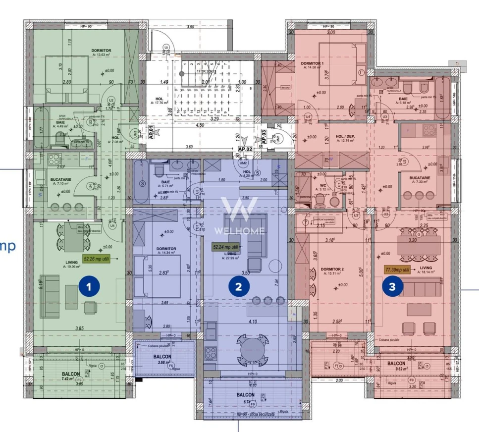 - Dormitor, living, bucatarie inchisa, baie, hol.