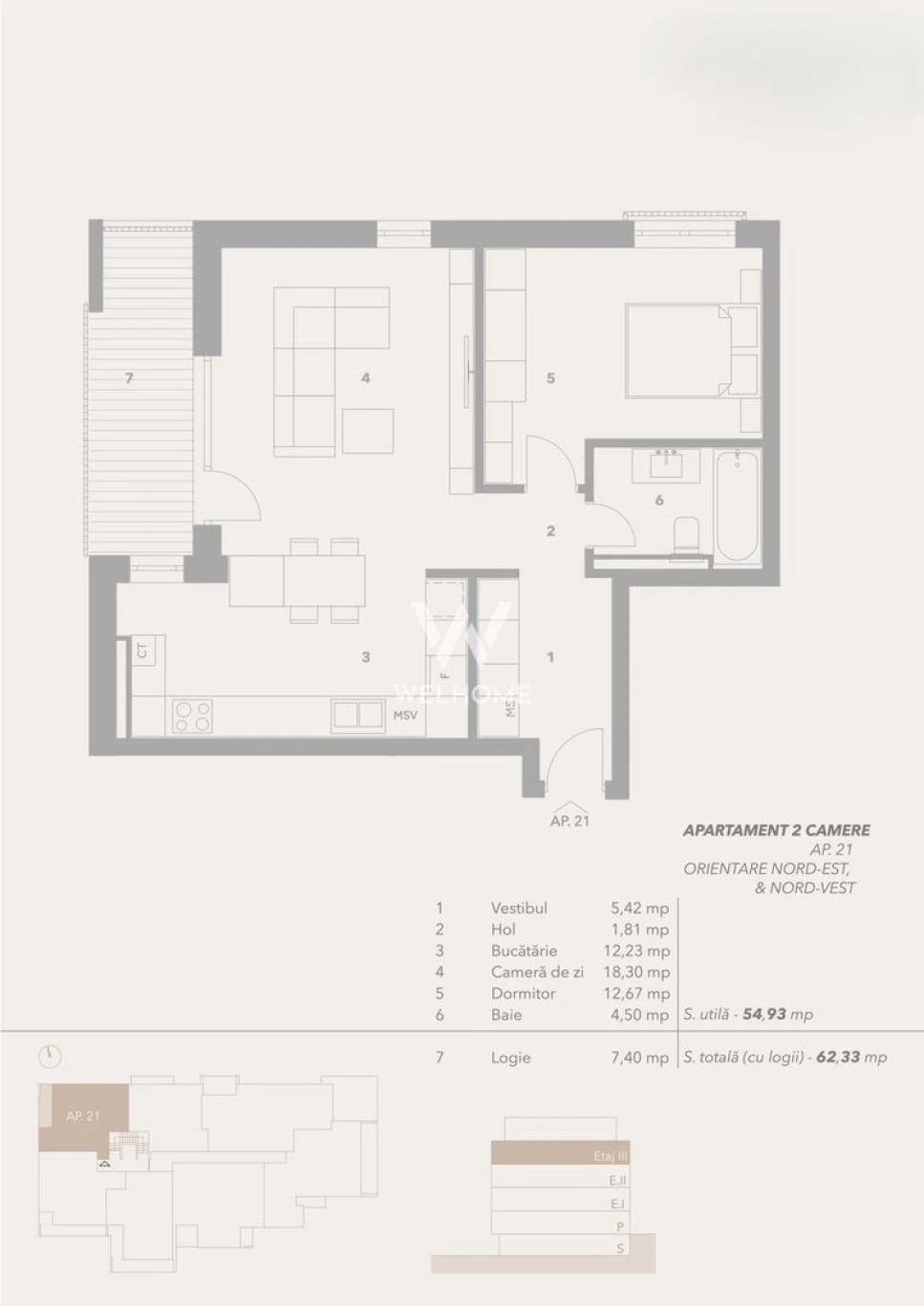 Etaj 3, apartament cu 2 camere 53,93. mpu + balcon 7 mpu