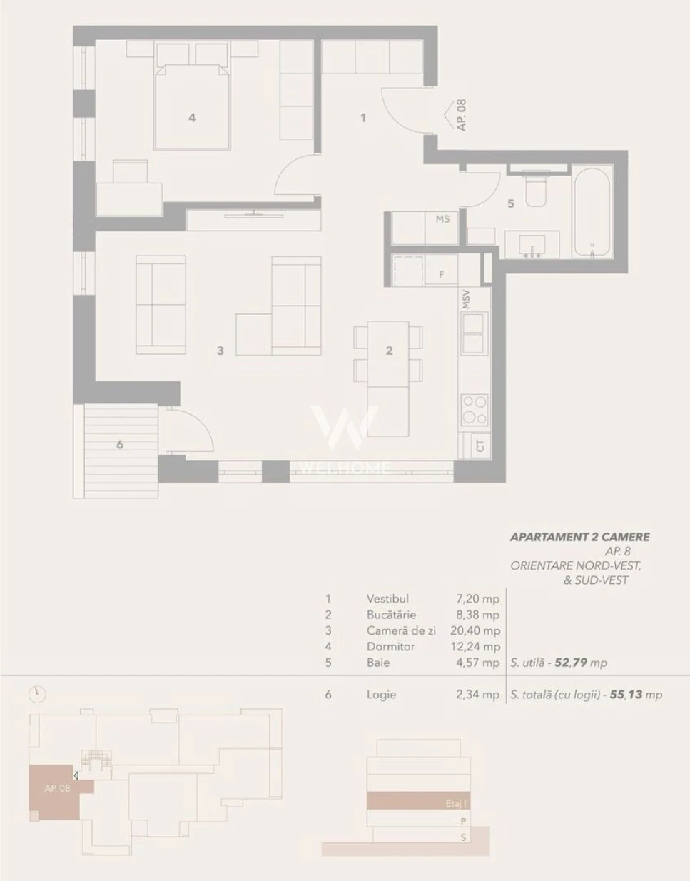 Etajul 1, apartament cu 2 camere 52.79. mpu + balcon 2.34 mpu