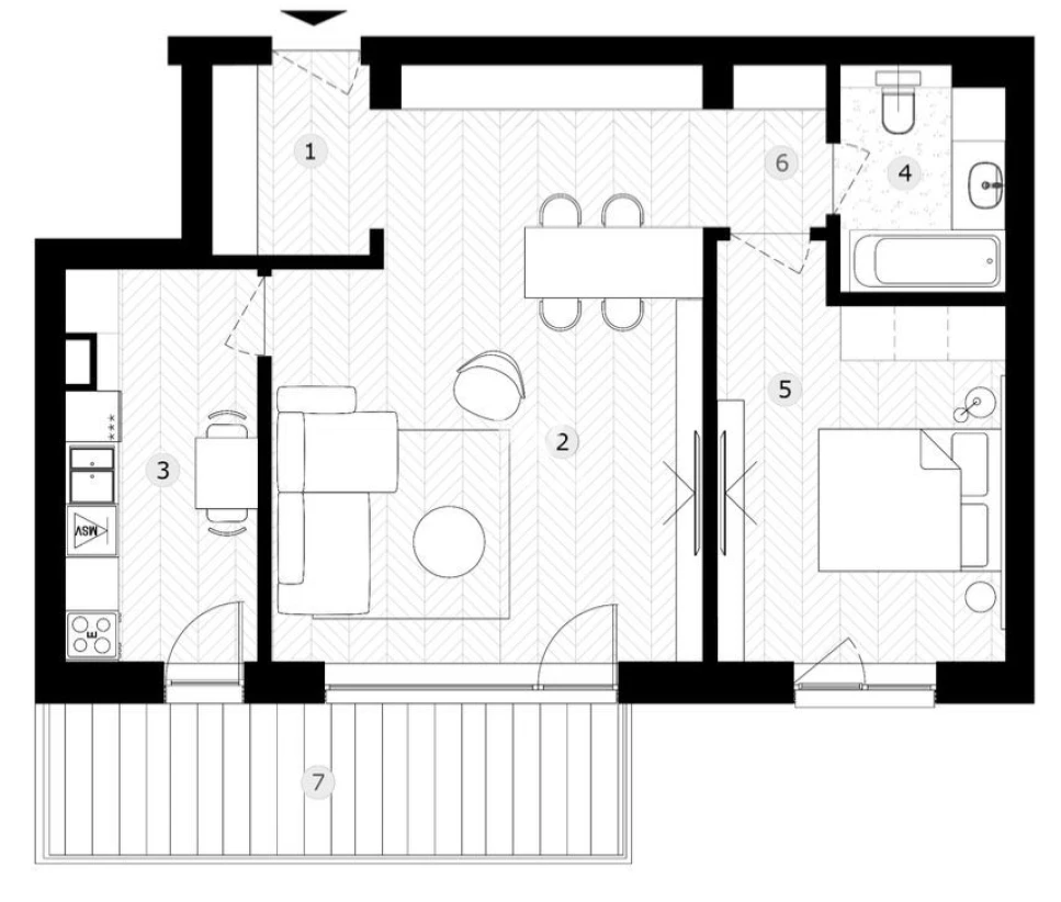 - Hol acces, living, bucatarie, dormitor, baie, balcon