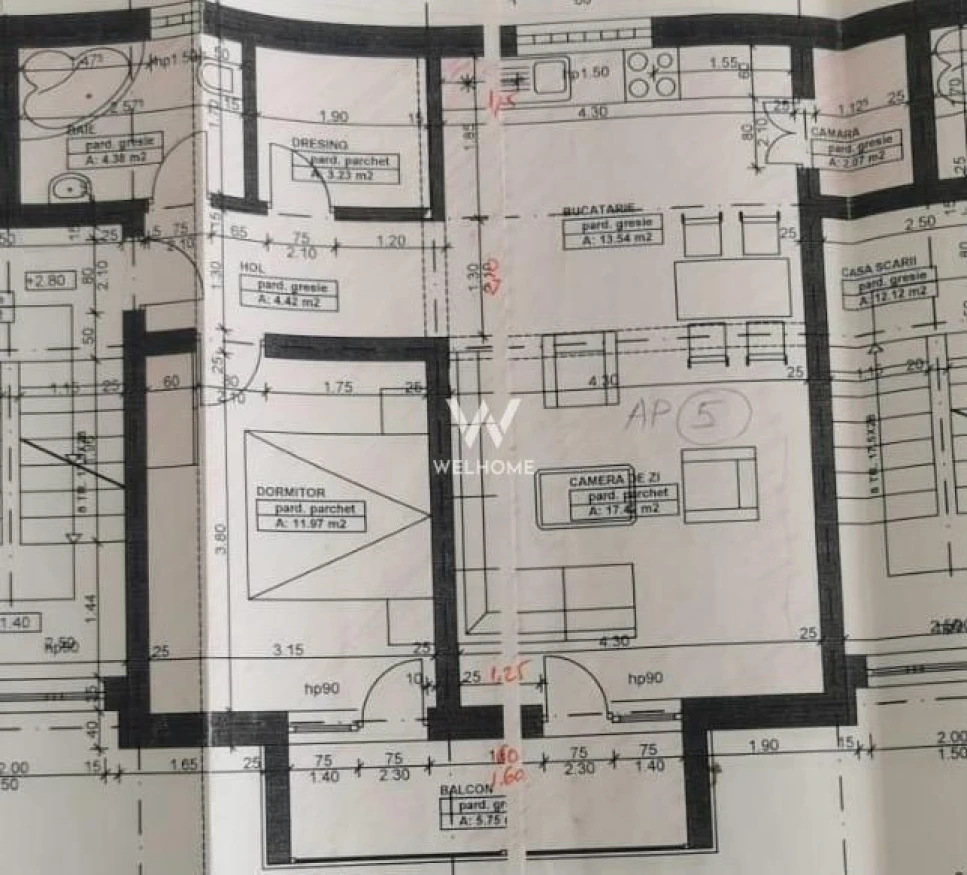 Hol, baie, dressing, dormitor , living spatios cu bucatarie, camara. Accesul pe balcon se poate face atat din living cat si din dormitor.