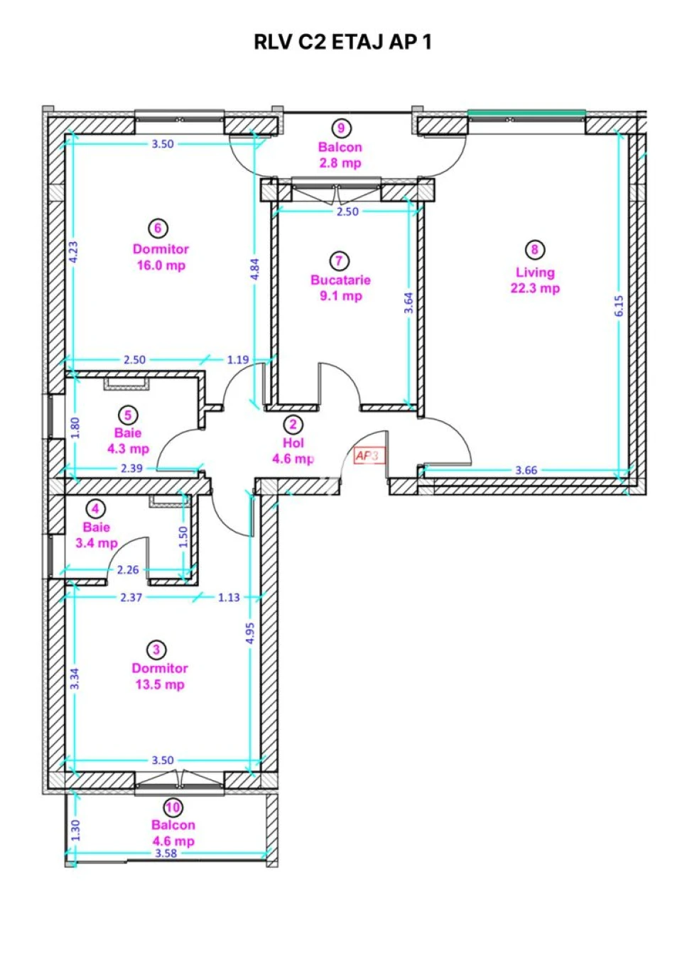 Apartament disponibil la parter cu predare la alb - suprafata utila - 64.9 mp utili si balcon 7.4 mp.