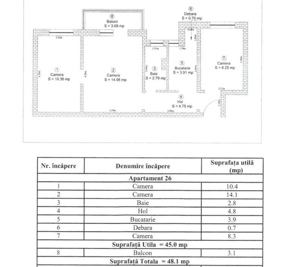 Locuința are o suprafață utilă de 45 mp, la care se adaugă un balcon închis de 3 mp, fiind compartimentată eficient astfel: