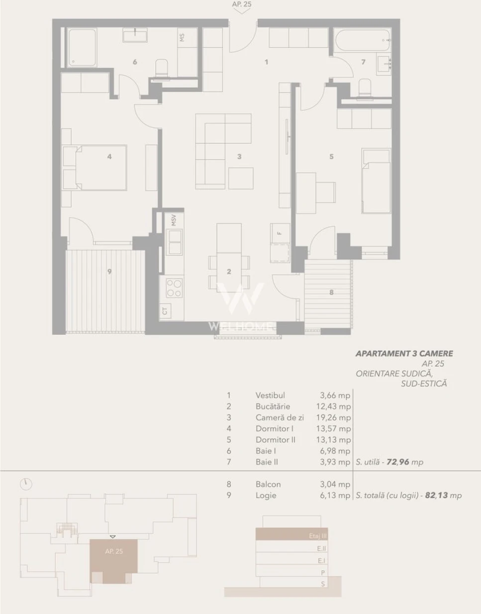 Etaj 3, apartament cu 3 camere 72.96. mpu + balcon si logie 9 mpu
