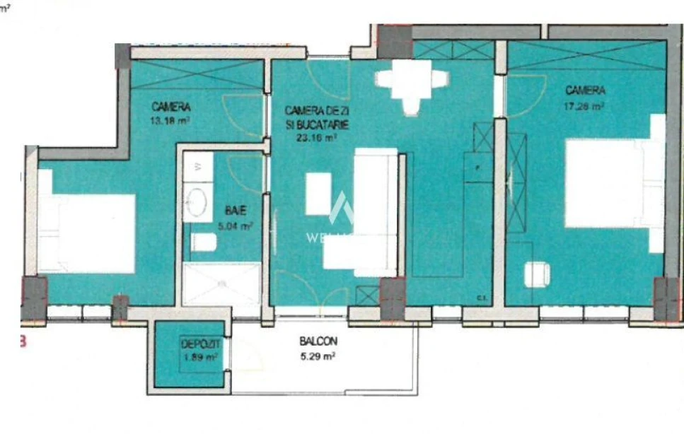 Compartimentare: hol, doua dormitoare, living cu bucatarie, baie cu geam, balcon, spatiu pentru depozitare