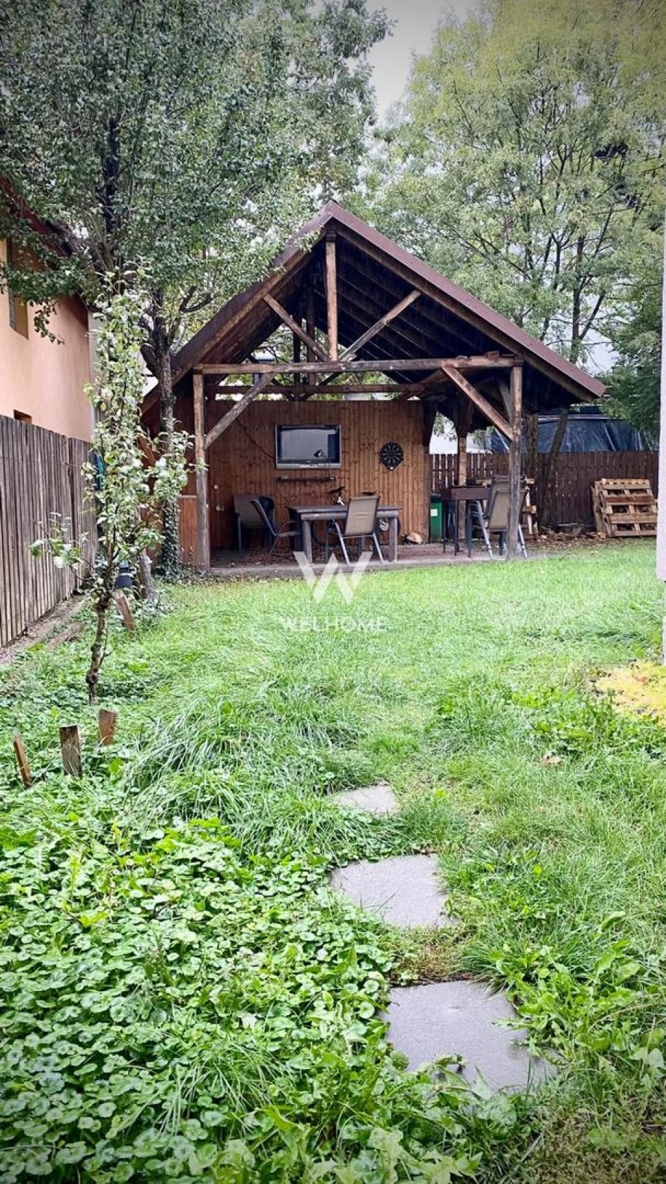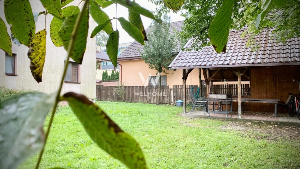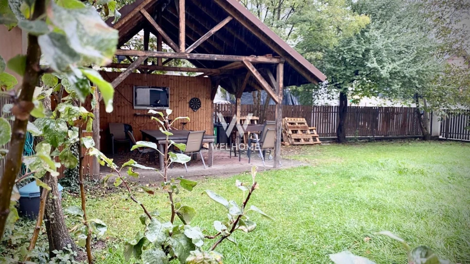 Curtea comuna ingradita cu 2 locuri de parcare private si o zona verde cu mult gazon, copaci, pomi fructiferi si o filigorie amenajata pentru BBQ.