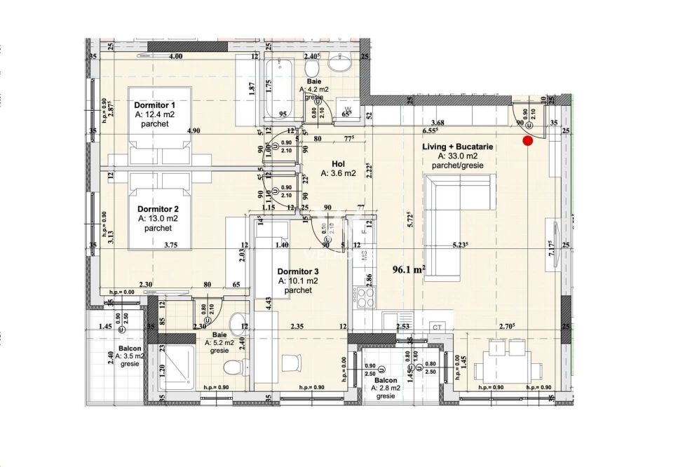 Hol larg ( poate fi compartimentat) living cu bucatarie - acces la un balcon. 3 dormitoare si 2 bai + 2 balcoane