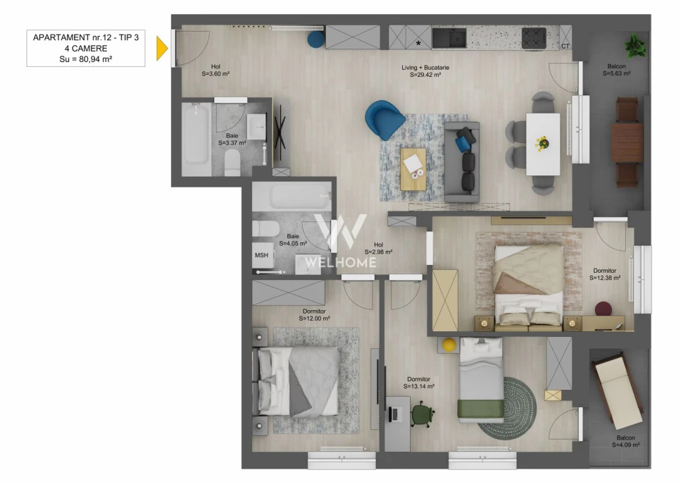 - Compartimentare: 3 dormitoare, living cu bucatarie open space, 2 bai, hol