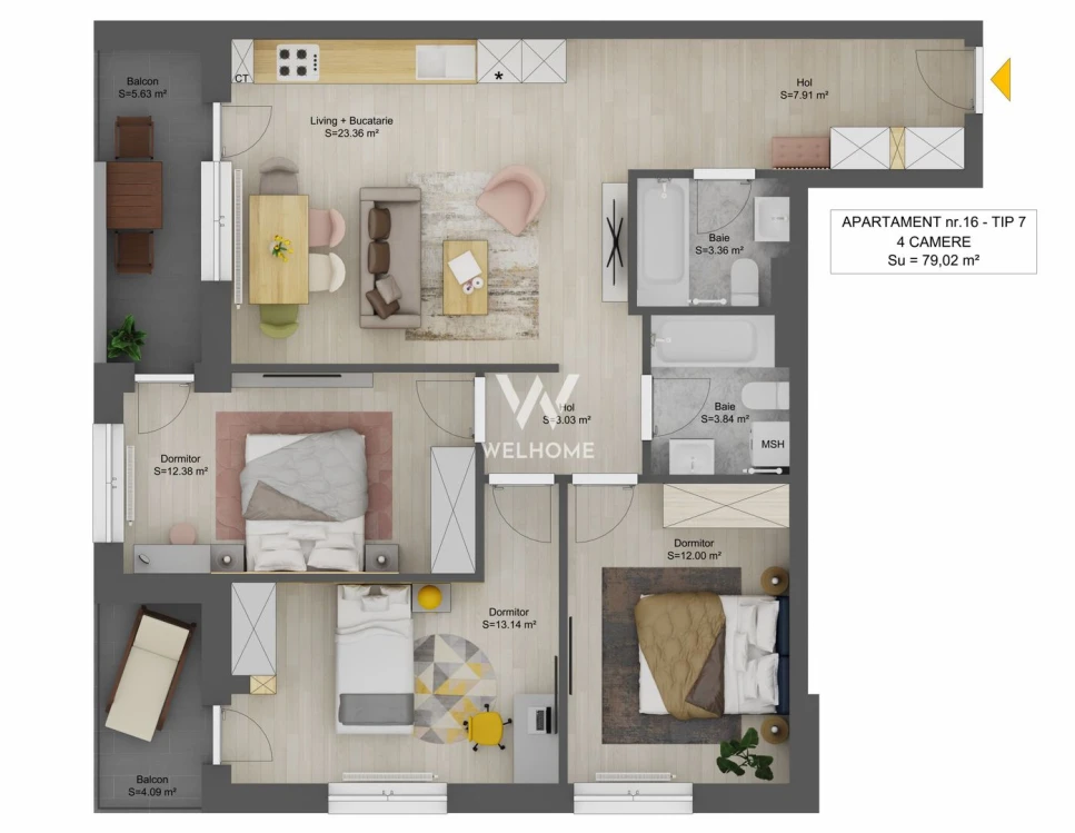 - Compartimentare: 3 dormitoare, living cu bucatarie open space, 2 bai, hol