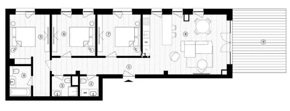 Hol acces, living cu bucatarie, trei dormitoare, trei bai, terasa