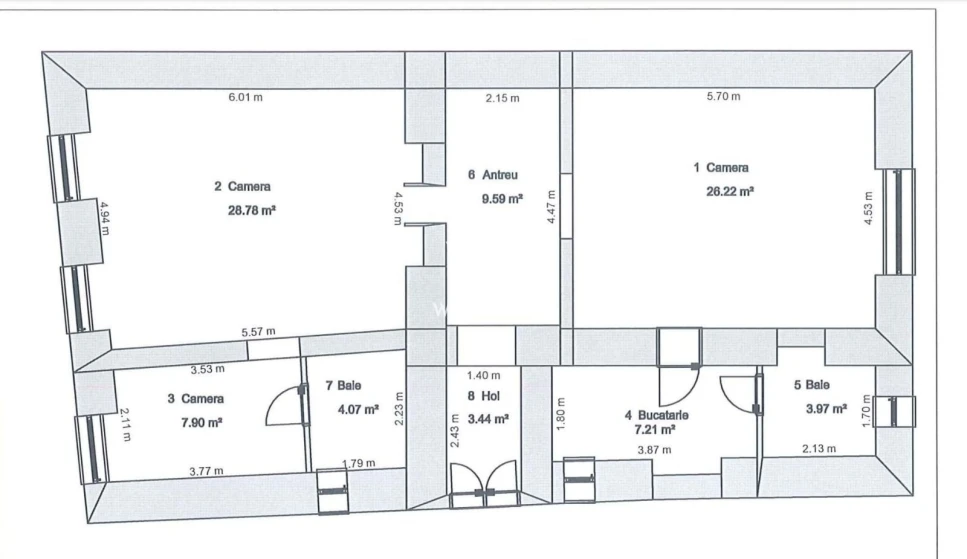 Compartimentare: 3 camere, bucatarie, antreu, hol si 2 bai.