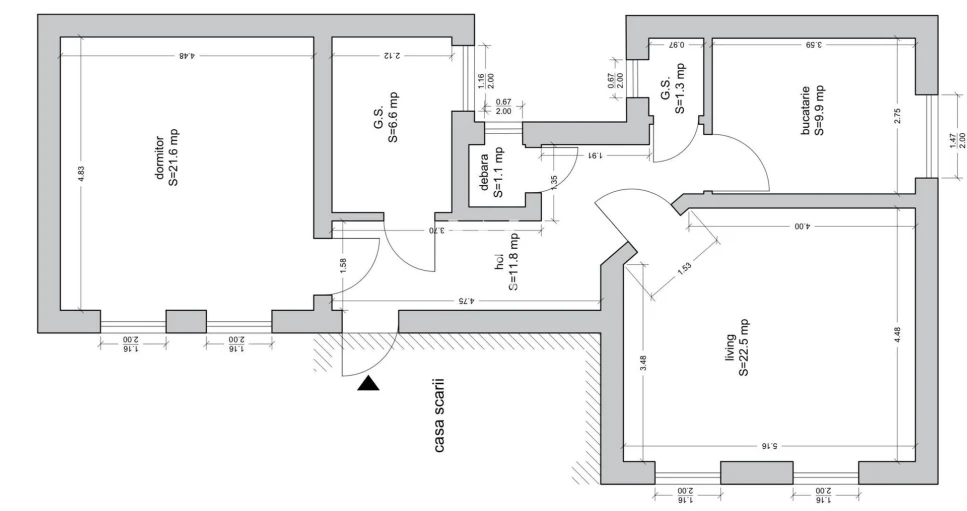 - Compartimentat astfel: hol acces, living, bucatarie separata, dormitor, baie cu geam, baie de serviciu si debara.