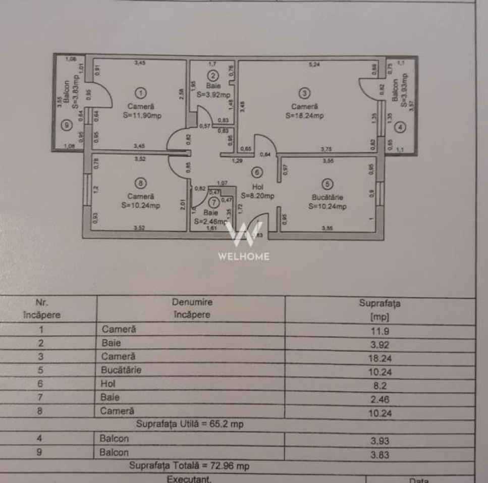 - Compartimentare: bucatarie, sufragerie, hol, doua dormitoare, doua bai, doua balcoane (fiecare de 4 mp)