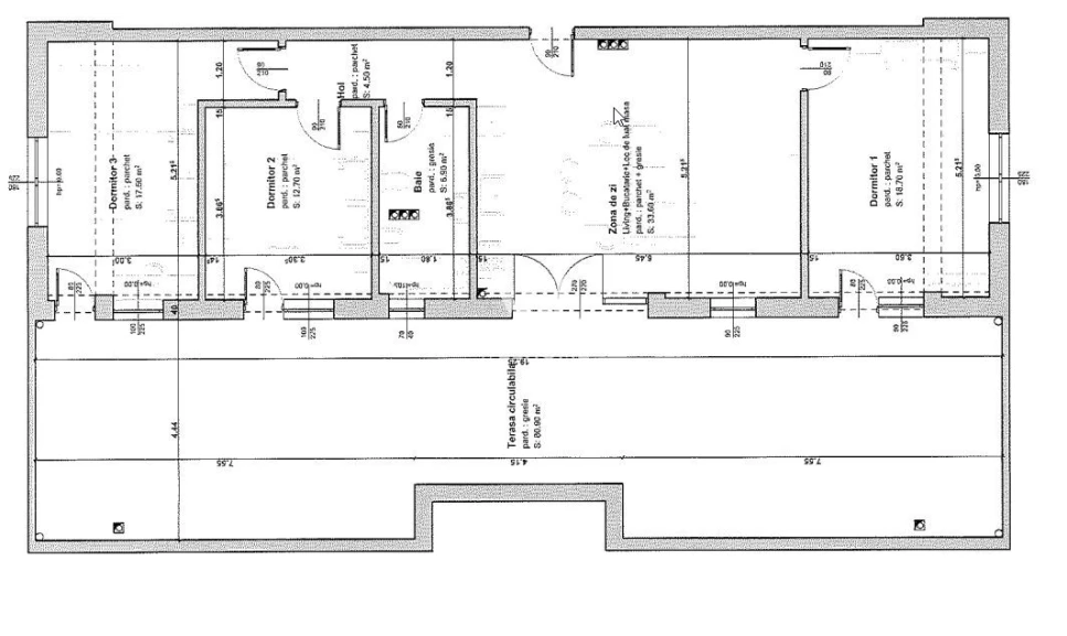Compartimentare: Hol, Living + Bucatarie, 3 dormitoare, Baie , Terasa (vezi schita)