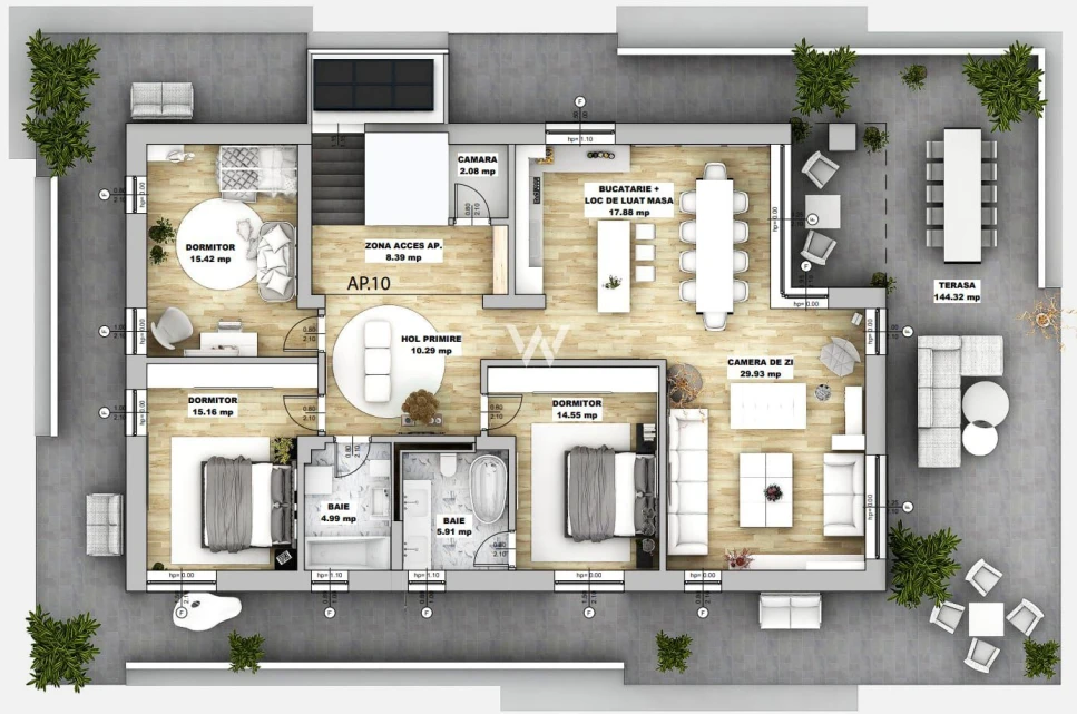 Va oferim spre vanzare un apartament de lux, de tip penthouse, situat in zona exclusivista a orasului Sibiu, cu vedere la Parcul Sub Arini. Acesta este unul dintre cele mai impresionante apartamente de vanzare din Sibiu, cu o suprafata totala de 275mp, din care 131mp suprafata utila si 144mp terasa generoasa. Compartimentarea este excelenta, cu un hol elegant si un spatiu de depozitare practic, 2 bai moderne, 3 dormitoare spatioase, dintre care unul cu baie proprie, living luminos cu iesire pe terasa si o bucatarie moderna, complet utilata. Apartamentul este amplasat la etajul retras al unui bloc deosebit de elegant, si beneficiaza de un lift personalizat, care se deschide direct in living. Pretul acestui apartament de vanzare este de 396270 euro (TVA 19% inclus), si include predarea LA ALB interior, cu posibilitate de finalizare la cheie. Apartamentul este intabulat, iar blocul dispune de parcare subterana si supraterana cu buncar si boxe de depozitare. Apartamentul va primi o parcare subterana, o parcare supraterana si o boxa la subsol. In plus, apartamentul este racordat la toate utilitatile, cu fibra optica disponibila si o instalatie pentru montarea unui jacuzzi pe terasa, care ofera privelisti impresionante asupra Parcului Sub Arini. Este o locatie premium, ideala pentru cei care cauta sa traiasca intr-un loc exclusivist, cu mult spatiu, aer curat si finisaje calitative. Pentru vizionari si informatii suplimentare despre acest apartament de vanzare in Sibiu, va rugam sa sunati la numarul de telefon 0752.088.381 si sa va programati pentru o vizita personala. Apartamentele de vanzare in Sibiu sunt ideale pentru cei care cauta o proprietate de lux intr-o locatie deosebita, cu priveliste panoramica asupra orasului si finisaje calitative. Cu o istorie bogata si arhitectura impresionanta, Sibiul este un oras stralucitor, plin de viata, arta si cultura. Acest apartament de vanzare este o oportunitate excelenta pentru cei care cauta sa investeasca intr-o proprietate exclusivista sau sa se mute intr-unul dintre cele mai bune apartamente de vanzare in Sibiu. Nu pierdeti ocazia de a va bucura de luxul si confortul oferit de acest apartament, contactati-ne astazi pentru informatii suplimentare si setati o programare pentru o vizita personala!