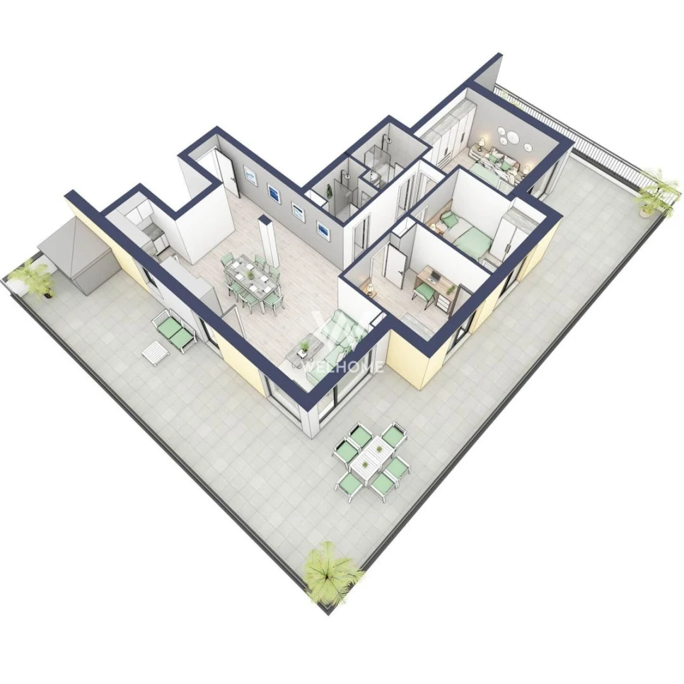 hol de acces, living cu bucatarie, 2 dormitoare, doua bai (compartimentare permite amenajarea unui al 3lea dormitor)+ terasa