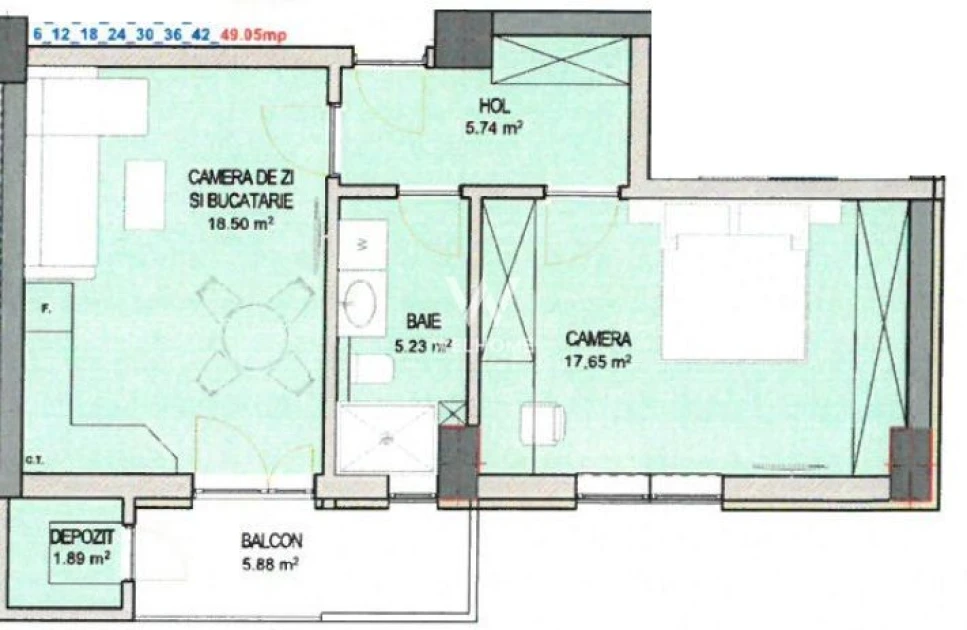 Apartamentul de 2 camere are o suprafata utila 49,05 mp si dispune de living cu bucatarie open space , un dormitor generos , baie si hol unde exista posibilitatea amenajarii placute ,, avand o suprafata de aproximativ 66 mp.