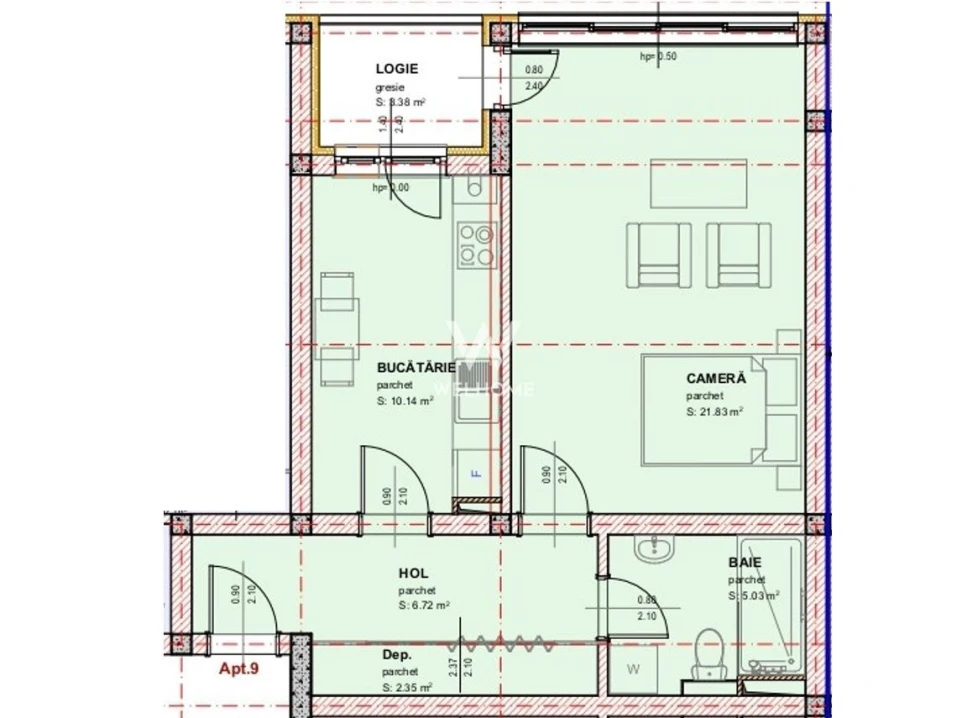 - Hol acces cu spatiu pentru depozitare, camera de zi, bucatarie, baie, balcon tip loja ( vezi schita )