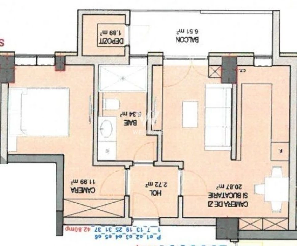 Compartimentare: hol, dormitor, living cu bucatarie, baie cu geam, balcon, spatiu pentru depozitare