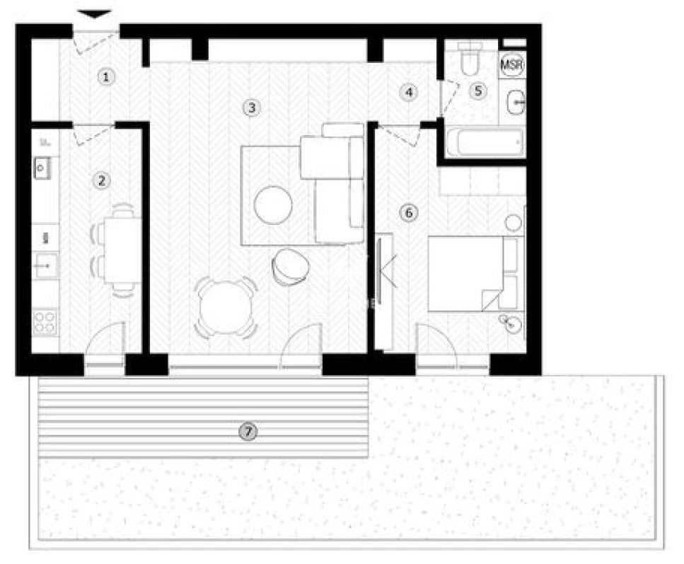 - Hol acces, living, bucatarie, dormitor, baie, terasa.